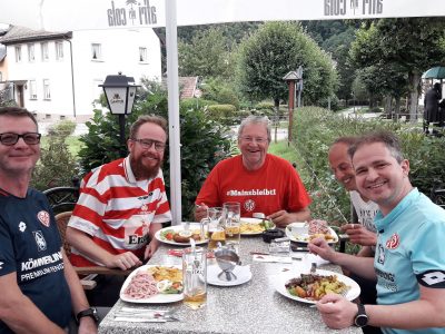 Die freundlichen Wingertsknorze sind so nett und lassen uns – wieder einmal- die Radtaschen in ihrem Bus parken, denn für das Einchecken im Hotel ist keine Zeit mehr. Verschwitzt wie wir sind und voller Hoffnung auf einen Auswärtsdreier gehen wir auf unsere Plätze.